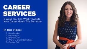 In this video, learn from Jennifer Iuvone in Career Services about 5 ways you can work towards your career goals this semester, including Handshake, PathwayU, BroncoLink, Work U and Internships, and the Career Fair.